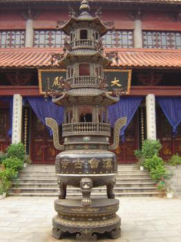 主佛靠背,是千手觀音,雕塑精美, 全身耀金。 相傳塑這尊觀音共花去白銀8000余兩。觀音前有一副對聯(lián):