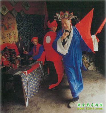 儺戲在湘西土家族地區(qū)也稱儺堂戲、儺神戲,它與土家族原始巫教、巫術(shù)的關(guān)系極為密切。土家族先民信奉的神有儺神、八部大神、土地神等,作為一種宗教活動(dòng),這種原始信仰與社會(huì)生產(chǎn)活動(dòng)、文娛活動(dòng)及民族習(xí)俗是融為一體的,因此儺戲最先的“沖儺還原”帶有明顯迷信色彩,土家族群眾中有“一儺沖百鬼,一愿了千神”的說法,湘西土家族人干脆叫它為“神戲”。湘西土家族儺戲的發(fā)展過程大體是儺、儺舞、儺儀然后才產(chǎn)生儺戲。儺舞源于久遠(yuǎn)的蒙昧?xí)r期,土家先民們?cè)谕笞匀蛔鞫窢?zhēng)、同毒蟲猛獸作斗爭(zhēng),便產(chǎn)生了化裝護(hù)面、在鼓樂聲中奔騰呼號(hào)、沖殺跳躍的原始儺舞,其所模擬的鳥雀舞、猿猴舞、熊舞等頗為壯觀。儺舞與儺這種驅(qū)鬼消災(zāi)的祭祀儀式結(jié)合后,增加了祈求人獸平安、五谷豐登、緬懷祖先、勸人去惡從善、以及傳播生產(chǎn)知識(shí)等內(nèi)容,這就逐漸形成了兼?zhèn)潢U弘教義及娛樂性質(zhì)的祭祀風(fēng)俗歌舞。[2]土家族儺戲就是在此基礎(chǔ)上發(fā)展起來的。部分土家族學(xué)者認(rèn)為土家族儺戲的遠(yuǎn)源可以追溯到戰(zhàn)國(guó)時(shí)代的《九歌》,《九歌》是土家族儺戲的雛形,他們的依據(jù)是當(dāng)時(shí)楚國(guó)的沅湘流域,人們“信巫鬼、重淫祀”(《漢書·地理志》),從而使得“陰陽人鬼之間,又或不能無褻慢淫荒之雜”(宋代朱熹《楚辭集注》)。屈原正是加工整理了這一類“鄙陋”之詞,才創(chuàng)作出《九歌》、《天問》等名篇。也有部分學(xué)者不贊同這種論點(diǎn),他們認(rèn)為土家族儺在宋代還停留在儺祭和儺舞階段,最遲到明代,土家族儺才發(fā)展成為儺戲[3]。嘉靖《常德府志》記載:“歲除,歲將盡數(shù)日,鄉(xiāng)村多用巫師,朱裳鬼面,鑼鼓喧舞竟夜,名曰還儺。”文中未點(diǎn)明“儺戲”二字,但卻使用了“還儺”一詞,這與今天民間對(duì)儺戲的稱呼相似。又據(jù)清乾隆《永順縣志》載:“永俗酬神,必延辰郡巫師唱演儺戲,……至晚,演儺戲。敲鑼擊鼓,人各紙面一,有女裝者,曰孟姜女;男扮者,曰范七郎。”在土家族儺戲中,孟姜女傳說故事占著非常重要的地位。在湘西土家族地區(qū),儺戲一般有二十四正戲,即二十四戲神。每次儺儀結(jié)束時(shí),巫師要用香火在黃裱紙上燒二十四個(gè)洞,以表示奠祭二十四戲神。民間有諺語:“儺神菩薩不識(shí)字,只要二十四個(gè)圈圈滿。”在二十四儺神中,被稱為勾愿神的姜女、范郎是還儺愿時(shí)非常重要的兩位神靈。在儺戲中,《孟姜女》是整場(chǎng)的高潮,平時(shí),儺戲唱完后,由沒下裝的孟姜女、范郎去向主人家及觀眾“拜臺(tái)”,以示“了愿”。清代中期以后,儺戲吸取了花燈、陽戲、高腔等其他地方戲劇劇種的唱腔和劇目,逐漸變得日益成熟。我們仔細(xì)查看了全國(guó)371個(gè)劇種,發(fā)現(xiàn)儺戲、花燈戲有著相同的班社,也就是說一個(gè)演出班社可以演出儺戲、花燈戲兩個(gè)劇種。這段時(shí)期,儺戲已作為獨(dú)立戲劇劇種參加演出。由于儺戲是由巫儺法事演變而成的戲劇形式,經(jīng)歷著巫儺法事(驅(qū)鬼祭祀)、儺壇上戲和儺堂正戲的發(fā)展過程。
