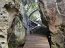 (后卡門)那是后卡門,有一夫當關,萬夫莫開之勢。過去是登黃石寨(黃獅寨)的唯一通道。1995年3月,江澤民總書記就是從這里上下黃石寨(黃獅寨)的。上山途中,江總書記在“天子座”景點休息時,興致勃勃地拉起二胡,為當?shù)氐?a class="insidelink" href="http://www.aisiboer.com/fengqing/" title="土家族">土家族女歌手伴奏;登上寨頂后,又情不自禁地唱起京劇《智取威虎山》中的“打虎上山”唱段,與游客們同樂。